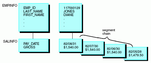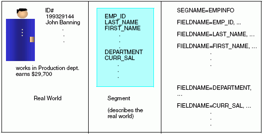 In the data source, one field represents each of these employee characteristics. The entire group of fields represents the employee. In Master File terms, this group is called a segment.