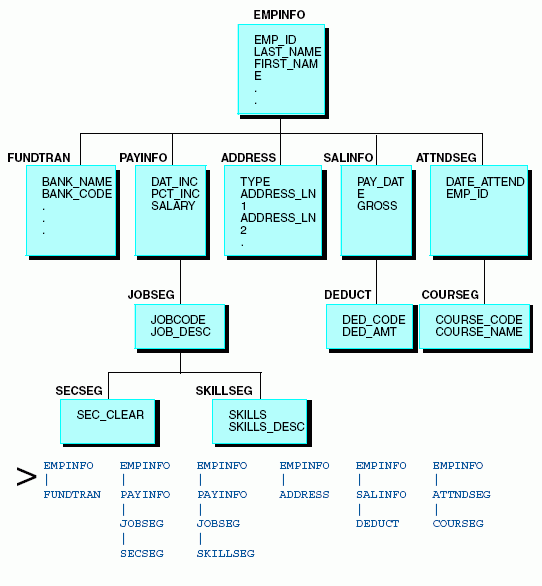 The EMPLOYEE data structure has six paths. The paths begin with the EMPINFO segment (the root), and end with: