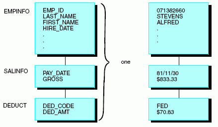In the following view of the EMPLOYEE data source, EMPINFO, SALINFO, and DEDUCT form a path. An instance of DEDUCT (paycheck deductions) can exist only if a related instance of SALINFO (the paycheck) exists, and the instance of SALINFO can exist only if a related instance of EMPINFO (the employee) exists.