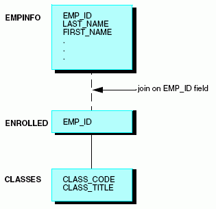 When you report from or update the new structure at any one time, the relationship is seen from the perspective of one of the original segments (in this case, from EMPINFO or CLASSES). Determine which segment perspective is used by making that segment the parent in the join. Describe the join using the JOIN command, or for FOCUS data sources, in the Master File. If you make the mediating segment, in this case ENROLLED, the child (cross-referenced) segment in the join, you implement the relationship as a standard one-to-many. If you make it the parent (host) segment, you implement the relationship as a standard one-to-one join.
