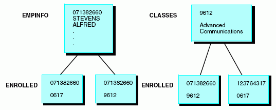 However, because some types of data sources cannot represent such a relationship directly, you must introduce a mediating segment called ENROLLED. This new segment contains the keys from both of the original segments, EMP_ID and CLASS_CODE, representing the relationship between the two original segments. It breaks the M:M relationship into two 1:M relationships. Each instance of EMPINFO can be related to many instances of ENROLLED (since one employee can be enrolled in many classes), and each instance of CLASSES can be related to many instances of ENROLLED (since one class can have many employees enrolled).