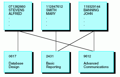 Consider the EMPINFO segment in the EMPLOYEE data source and the CLASSES segment in a hypothetical SCHOOL data source. Each instance of EMPINFO describes one employee, and each instance of CLASSES describes one course. Each employee can take many courses, and many employees can take each course, so this is a many-to-many relationship. This type of relationship is illustrated in the following diagram.
