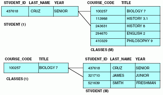 A direct many-to-many relationship can exist between two relational tables. The STUDENT table contains one row for each student enrolled at a college, and the CLASSES table contains one row for each class offered at the college. Each student can take many classes, and many students can take each class.