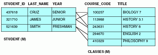 When the M:M relationship is seen from the perspective of either of the two tables, it looks like a 1:M relationship. One student taking many classes (1:M from the perspective of STUDENT), or one class taken by many students (1:M from the perspective of CLASSES). This type of relationship is illustrated in the following diagram.