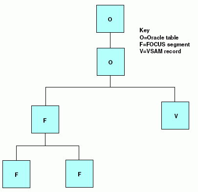 The JOIN command enables you to join segments from different data sources, creating temporary data structures containing related information from otherwise incompatible sources. For example, you can join two Oracle data sources to a FOCUS data source to a VSAM (C-ISAM for WebFOCUS) data source, as illustrated in the following diagram.
