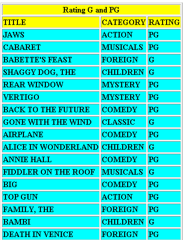 TABLE FILE MOVIES HEADING CENTER "Rating G and PG" PRINT TITLE CATEGORY RATING WHERE G_RATING ON TABLE SET PAGE NOPAGE ON TABLE SET GRID OFF ON TABLE SET STYLE * type=report, style=bold, color=black, backcolor=yellow, $ type=data, backcolor=aqua, $ ENDSTYLE END