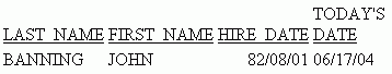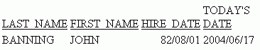 TABLE FILE EMPLOYEE PRINT LAST_NAME FIRST_NAME HIRE_DATE TDATE AS 'TODAY''S,DATE' WHERE LAST_NAME EQ 'BANNING' END