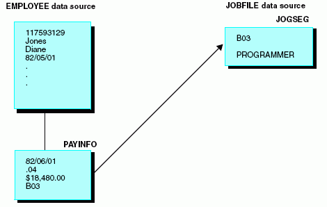 Although the Employee Information and Job Description segments are stored in separate data sources, for reporting purposes the EMPLOYEE data source is treated as though it also contains the Job Description segment from the JOBFILE data source. The actual structure of the JOBFILE data source is not affected.