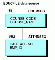 Consider the EDUCFILE data source used in our example. The COURSEG segment is the root and describes each course. ATTNDSEG is a child and includes employee attendance information:
