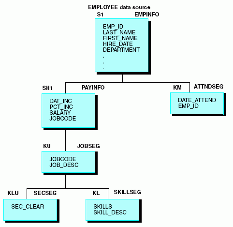 FILENAME = EMPLOYEE, SUFFIX = FOC, $ SEGNAME = EMPINFO, SEGTYPE = S1, $ FIELDNAME = EMP_ID, ALIAS = EID, FORMAT = A9, $ . . . SEGNAME = PAYINFO, SEGTYPE = SH1, PARENT = EMPINFO, $ FIELDNAME = JOBCODE, ALIAS = JBC, FORMAT = A3, $ . . . SEGNAME = JOBSEG, SEGTYPE = KU, PARENT = PAYINFO, CRFILE = JOBFILE, CRKEY = JOBCODE, $ SEGNAME = SECSEG, SEGTYPE = KLU,PARENT = JOBSEG, CRFILE = JOBFILE, $ SEGNAME = SKILLSEG,SEGTYPE = KL, PARENT = JOBSEG, CRFILE = JOBFILE, $ SEGNAME = ATTNDSEG,SEGTYPE = KM, PARENT = EMPINFO, CRFILE = EDUCFILE, CRKEY = EMP_ID, $ SEGNAME = COURSEG, SEGTYPE = KLU,PARENT = ATTNDSEG, CRFILE = EDUCFILE, $