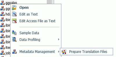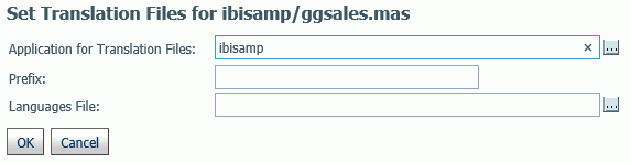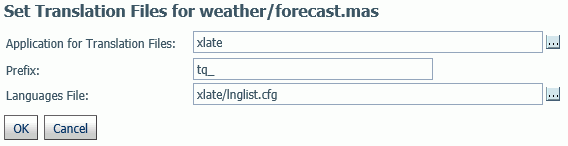 Alternately, you can right-click the forecast synonym, point to Metadata Management, and select Prepare Translation Files. The Set Translation File for weather/forecast.mas page opens, as shown in the following image. Enter the values shown in the following image and click OK.