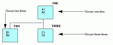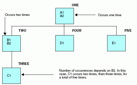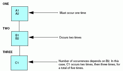 Since field C1 repeats with relation to fields B1 and B2, which repeat in relation to fields A1 and A2, field C1 is described as a separate, descendant segment of Segment TWO, which is in turn a descendant of Segment ONE.