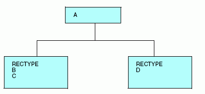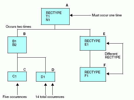 The relationship between the records of various types is expressed as parent-child relationships. The children that contain record types 02 and 03 do not have an OCCURS attribute. They are distinguished from their parent by the field declaration where field=RECTYPE.