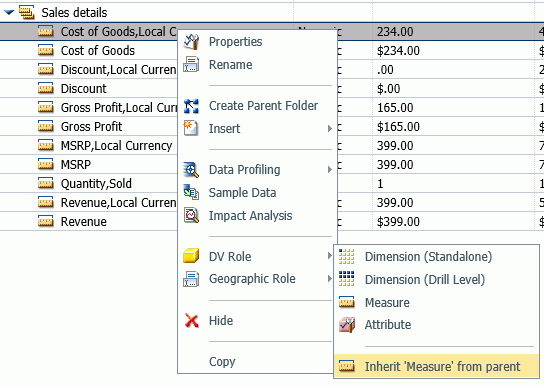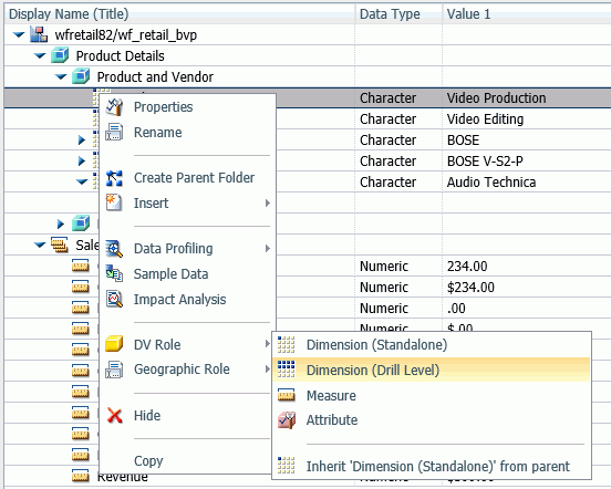A field can be assigned the role Dimension (Standalone) or Dimension (Drill Level). When it is assigned the role Dimension (Drill Level), it becomes part of a hierarchy, where the levels depend on the order of the fields in the folder. Then, when AUTODRILL is turned on, automatic drill-downs are created in the report or chart output. The following image shows the choices for DV role when you right-click a dimension field.