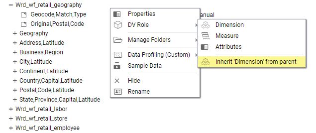 You can explicitly assign a DV role to a folder or field, or have it automatically inherit its role from its parent. If you explicitly assign a DV role, that role moves with the object if you drag it to another location within the BV+ structure. If you do not explicitly assign a DV role, the role changes as you move the object under a new parent, except if you drop it onto a field with the Drill Level role. If dropped onto a Drill Level field, the moved field inherits the Drill Level role.