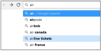Most search engines have the capability to present users with completed suggestions in their search field based on the initial letters of a term being specified. The following image shows an example from Google.com where a user is typing "air" into the search field. Several completed suggestions are generated, including "airline tickets", which is a popular search term for many users.