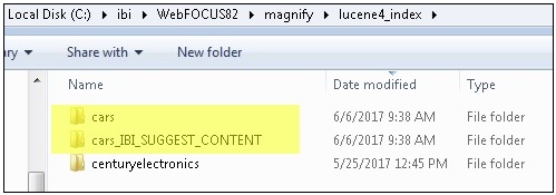 To use Auto Complete with Magnify Search, you must first generate a suggestion index for each index you will be searching against. These suggestion indices must be stored in the same location where your standard indices are located and have a suffix of _IBI_SUGGEST_CONTENT. In the following example, the cars index is located in C:\ibi\WebFOCUS82\magnify\lucene4_index along with a new corresponding suggestion index called cars_IBI_SUGGEST_CONTENT.