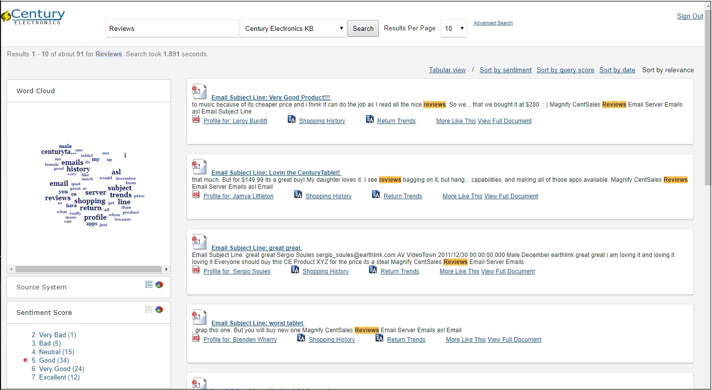 The following image shows the Century Electronic sample search application: