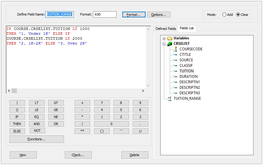 IF COURSE.CRSELIST.TUITION LT 1000 THEN '1. Under 1K' ELSE IF COURSE.CRSELIST.TUITION LT 2000 THEN'2. 1K-2K' ELSE '3. Over 2K' |