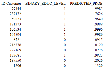 The DEFINE FILE command in the following request creates two education levels: doctorate level (value 1) and no college education (value 0). It also creates other virtual fields with numeric formats that can be used by the function. The TABLE request uses BLR_CLASSIFY to compute the probability that the education level belongs to class 1, doctorate level education, using predictors age, income, population range, and gender.