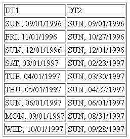 DT1 DT2 --- --- SUN, 09/01/1996 TUE, 09/03/1996 FRI, 11/01/1996 MON, 11/04/1996 SUN, 12/01/1996 TUE, 12/03/1996 SAT, 03/01/1997 TUE, 03/04/1997 TUE, 04/01/1997 WED, 04/02/1997 THU, 05/01/1997 FRI, 05/02/1997 SUN, 06/01/1997 TUE, 06/03/1997 MON, 09/01/1997 TUE, 09/02/1997 WED, 10/01/1997 THU, 10/02/1997