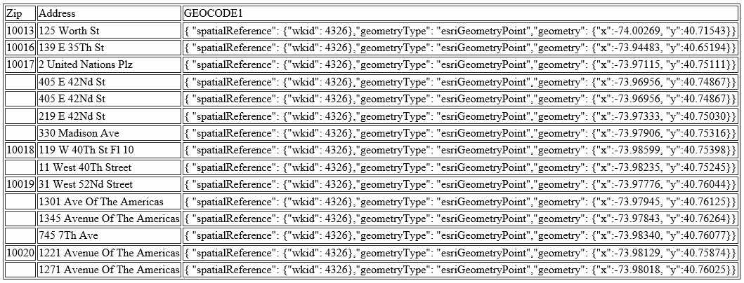 DEFINE FILE WF_RETAIL_LITE GEOCODE1/A200 = GIS_GEOCODE_ADDR_CITY(ADDRESS_LINE_1, CITY_NAME , STATE_PROV_NAME); END TABLE FILE WF_RETAIL_LITE PRINT ADDRESS_LINE_1 AS Address GEOCODE1 BY POSTAL_CODE AS Zip WHERE CITY_NAME EQ 'New York' WHERE POSTAL_CODE FROM '10013' TO '10020' ON TABLE SET PAGE NOPAGE END
