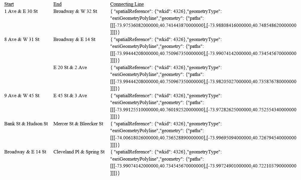 Given two geometry points or lines, GIS_LINE builds a JSON line. The output is returned in text format.