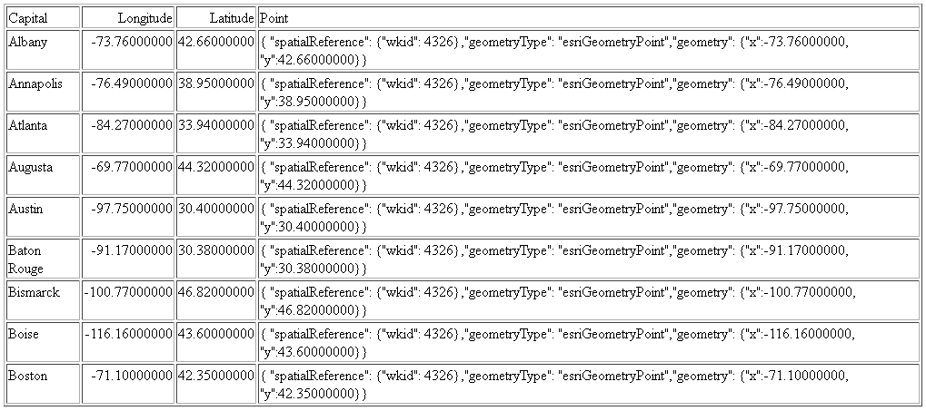 The following request uses the spatial reference code 4326 (decimal degrees) and state capital longitudes and latitudes to build a geometry point.