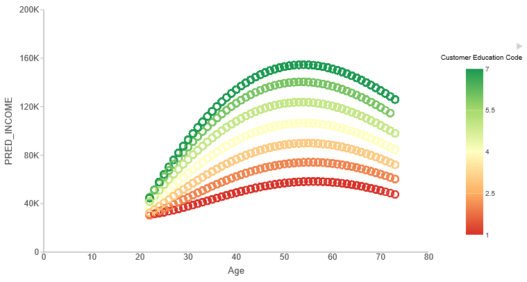 ENDThe output is shown in the following image. Predicted income versus age is plotted, with education level as a parameter visualized by color.