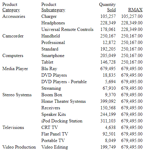 The output is shown in the following image. The first value for RMAX is the value in the Accessories category for Quantity Sold, as there is no prior value. The second value for RMAX is the value for Headphones, as that value is larger. The third value for RMAX is still the value for Headphones, as that value is larger than the Quantity Sold value in the third row. Since the maximum value in the table occurs for Blu Ray, that value is repeated on all future rows, as there is no reset point.