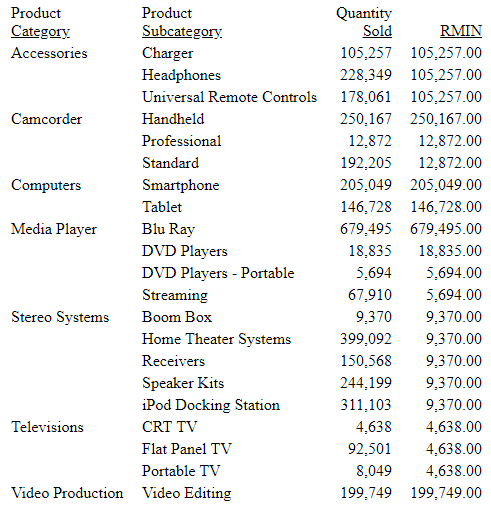 The output is shown in the following image. The first value for RMIN is the value in the Accessories category for Quantity Sold, as there is no prior value. The second value for RMIN is the value from the first row again (Charger), as that is smaller than the value in the second row. The third is the same again, as it is still the smallest. Then, the calculations start over for Camcorder, which is the reset point.