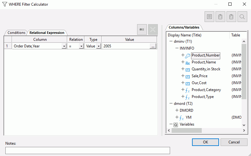 The following options are available if you click the Relational Expression tab:
