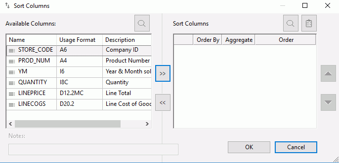 The Sort Columns dialog box contains the following fields and options: