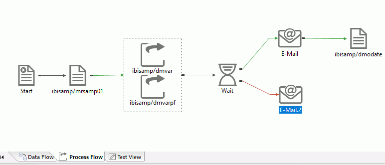 In the process flow shown in the following image, a setup procedure prepares the environment for data extraction. Two data flows are grouped to run simultaneously, followed by a Wait object. When the processing of both data flows is complete, one of two email messages is sent: one if the previous step is successful, the other if the previous step is unsuccessful. After a successful run, a cleanup procedure is executed to prepare for the next scheduled process flow run.