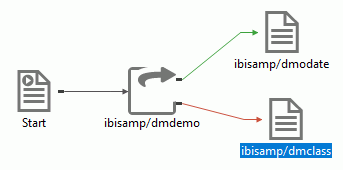 The branching process flow shown in the following image is built in Exercise 2: Creating the Process Flow. It is strongly suggested that you complete these exercises in order to create the branches shown here. As you do so, you will become familiar with many aspects of data and process flow design in the DMC.