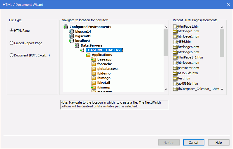 In App Studio, you create an HTML page using the HTML canvas. When you create a new HTML page, you use the HTML/Document Wizard. You can access the HTML/Document Wizard from the HTML/Document command on the Home tab or from the shortcut menu in the Environments Tree panel.