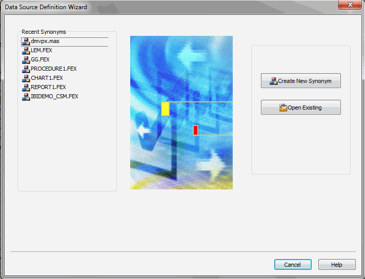 If you click Open Existing, the Selecting Data Source pane of the Data Source Definition Wizard is displayed. Select a data source to edit and click Finish to open the Metadata canvas.