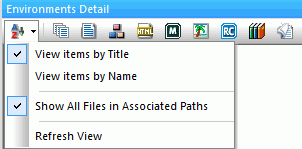 In App Studio, for a synonym that you create in the Metadata canvas to show in the Configured Environments tree of the Environments Detail panel, you must select the Show All Files in Associated Paths option in the View Options drop-down menu. The View Options drop-down menu and the Show Files in Associated Paths option are shown in the following image.