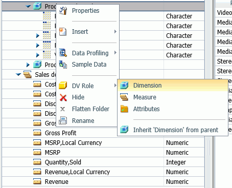 A field can be assigned the role Dimension (Standalone) or Dimension (Drill Level). When it is assigned the role Dimension (Drill Level), it becomes part of a hierarchy, where the levels depend on the order of the fields in the folder. Then, when AUTODRILL is turned on, automatic drill-downs are created in the report or chart output. The following image shows the choices for DV role when you right-click a dimension field.