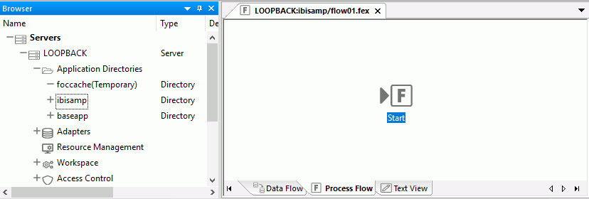When you create a new flow and click the Process Flow tab in the workspace, a Start object appears in the workspace to anchor the flow, as shown in the following image.