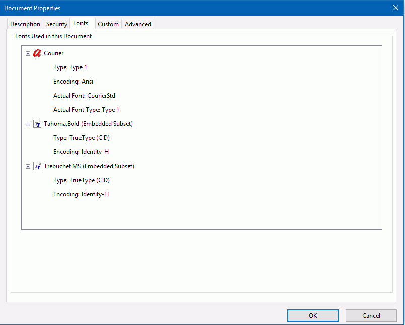 To confirm that a subset of the font is embedded, save a copy of the PDF file and open it in Adobe Reader. On the File menu, select Properties. In the Font tab, look for the words Embedded Subset next to the font name, as shown in the following image for the Tahoma and Trebuchet MS fonts.