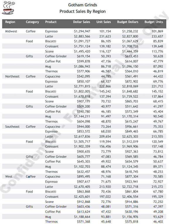 The following request against the GGSALES data source places the coffee image (coffee.gif) on the page and layers the watermark image (internalonlyport.gif) on top. These images are displayed on every page of the report.
