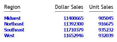TABLE FILE GGSALES SUM DOLLARS UNITS BY REGION ON TABLE PCHOLD FORMAT PDF ON TABLE SET PAGE NOPAGE ON TABLE SET STYLE * TYPE = TITLE, FONT='Trebuchet MS',$ TYPE = DATA, FONT='Tahoma', style=bold, size=10, color=blue, $ END