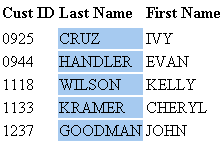 This report procedure (videorpt.fex) can generate both HTML and PDF output. When it generates HTML output, it uses an external cascading style sheet (reports.css) to format the report. When it generates PDF output, it uses an inline WebFOCUS StyleSheet. In both cases, the report provides a light blue background for the LASTNAME column and makes all column titles bold.