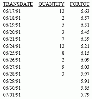 TABLE FILE VIDEOTRK SUM QUANTITY COMPUTE FORTOT=FORECAST_LINEAR(MODEL_DATA,QUANTITY,1,3); BY TRANSDATE ON TABLE SET PAGE NOLEAD ON TABLE SET STYLE * GRID=OFF,$ ENDSTYLE END