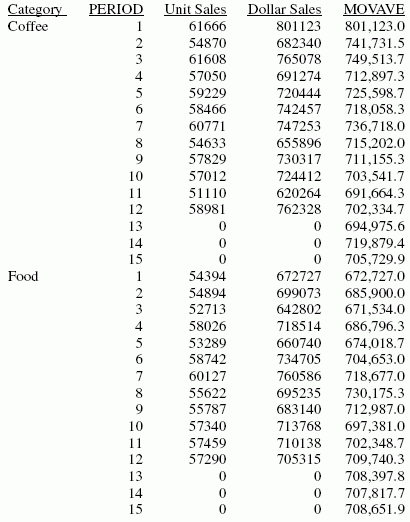 DEFINE FILE GGSALES SDATE/YYM = DATE; SYEAR/Y = SDATE; SMONTH/M = SDATE; PERIOD/I2 = SMONTH; END TABLE FILE GGSALES SUM UNITS DOLLARS COMPUTE MOVAVE/D10.1= FORECAST_MOVAVE(MODEL_DATA, DOLLARS,1,3,3); BY CATEGORY BY PERIOD WHERE SYEAR EQ 97 AND CATEGORY NE 'Gifts' ON TABLE SET STYLE * GRID=OFF,$ ENDSTYLE END