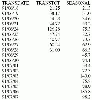 TABLE FILE VIDEOTRK SUM TRANSTOT COMPUTE SEASONAL/D10.1 = FORECAST_SEASONAL(MODEL_DATA,TRANSTOT,1,3,3,3,1000,1); BY TRANSDATE WHERE TRANSDATE NE '19910617' ON TABLE SET STYLE * GRID=OFF,$ ENDSTYLE END