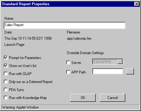 1. Right-click the report name and select Properties. The Report Properties dialog box opens.