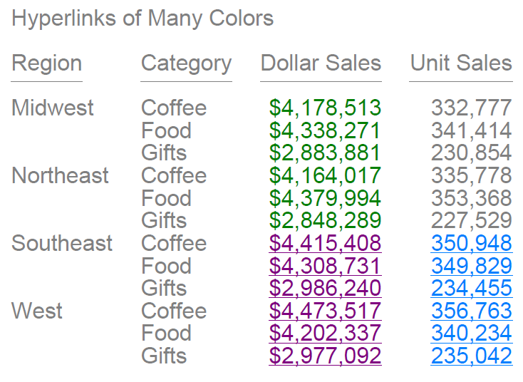 TABLE FILE GGSALES SUM DOLLARS/D12CM UNITS/D12C BY REGION BY CATEGORY HEADING "Hyperlinks of Many Colors" "" ON TABLE SET PAGE-NUM OFF ON TABLE PCHOLD FORMAT PDF ON TABLE SET STYLE * TYPE=REPORT, SQUEEZE=ON, FONT=ARIAL, GRID=OFF, COLOR=GREY, HYPERLINK-COLOR='SLATE BLUE',$ TYPE=DATA, COLUMN=UNITS, WHEN=REGION GE 'O', URL='http://www.ibi.com',$ TYPE=DATA, COLUMN=DOLLARS, COLOR=GREEN, HYPERLINK-COLOR='PURPLE',$ TYPE=DATA, COLUMN=DOLLARS, WHEN=REGION GE 'O', URL='http://www.ibi.com',$ ENDSTYLE END