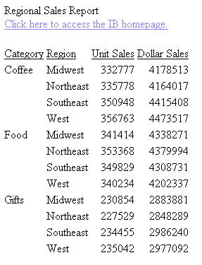 TABLE FILE GGSALES ON TABLE SET PAGE-NUM OFF SUM UNITS AND DOLLARS BY CATEGORY BY REGION HEADING "Regional Sales Report" " " ON TABLE SET STYLE * TYPE=REPORT, GRID=OFF, $ TYPE=DATA, COLUMN=REGION, URL=/ibi_apps/WFServlet?(IBIF_ex='ggdrill' AREA=REGION IBIC_server='EDASERVE' IBI_APPS='IBISAMP'),$ ENDSTYLE END